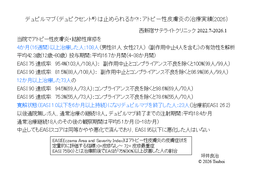 デュピルマブ(デュピクセント®)が日本で発売されて8年近く、当院で治療を開始して3年半経過しましたが、その優れた効果と安全性から重症アトピー性皮膚炎の治療が劇的に変わりました。当院での治療実績については、「院長ブログ12 デュピクセント®による治療実績(2026)」を参照してください。デュピルマブの優れた治療効果で、当院では最近デュピルマブ治療を終了して、通常治療(外用薬などによる保存的治療)に移行する人が増えています。ここでは、どのようにすれば止められるのか、また再悪化しないためにはどのようなことに気を付ければ良いかについて考えてみたいと思います。デュピルマブをそろそろ止めたいと考えている患者様に、出口戦略について情報提供したいと思います。