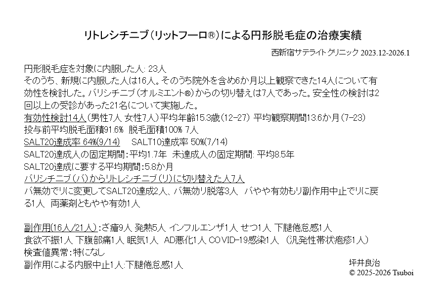 当院で、2026年1月までにリトレシチニブを内服した人は23名でした(添付資料)。内服の前提条件は、脱毛面積50%以上で、6か月以上固定している12歳以上の円形脱毛症の人です。そのうち、新規にJAK阻害薬を内服した人は16人で、そのうち当院を含め6か月以上経過観察できた14人について解析しました。平均年齢は15.3歳で、成人は2名だけでした。平均観察期間は13.6か月(7-23か月)でした。投与前の平均脱毛面積は91.6%で、脱毛面積100%の人は7人でした。重症度は国際臨床試験における平均脱毛面積90.3%とほぼ同等でした。